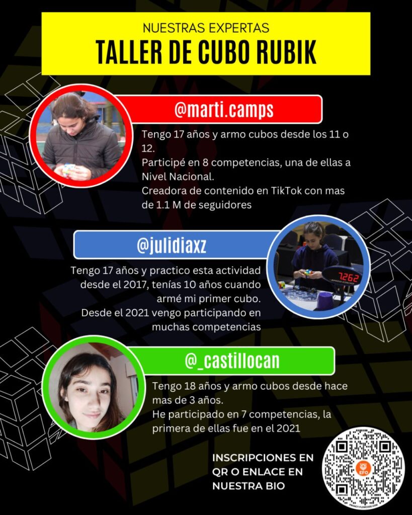 También contaba con un coordinador pedagógico que gestionaba la logística de la participación de los estudiantes en las diferentes competencias científicas, y que se comunicaba de forma estrecha con las familias y los directivos de las escuelas de los estudiantes participantes. En septiembre del año 2023 desarrollamos un taller de RUBIK dictado por chicas campeonas en esta temática